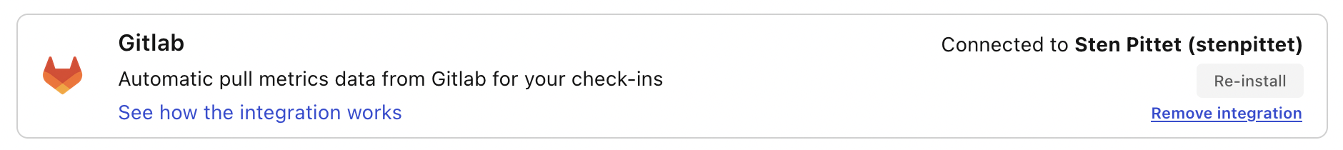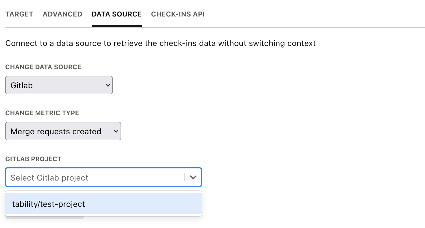 You can connect Tability to Gitlab to automatically pull metrics from Gitlab for your check-ins without having to switch context.