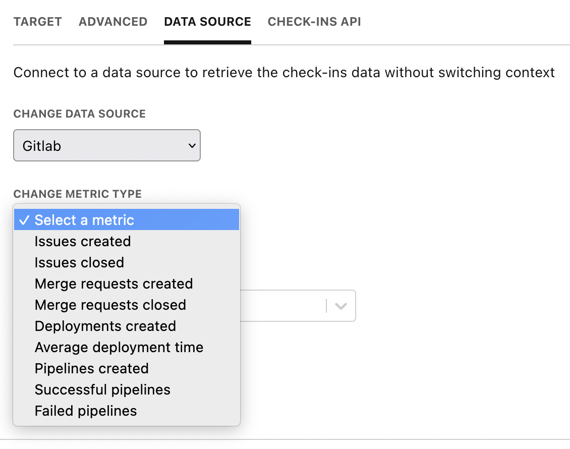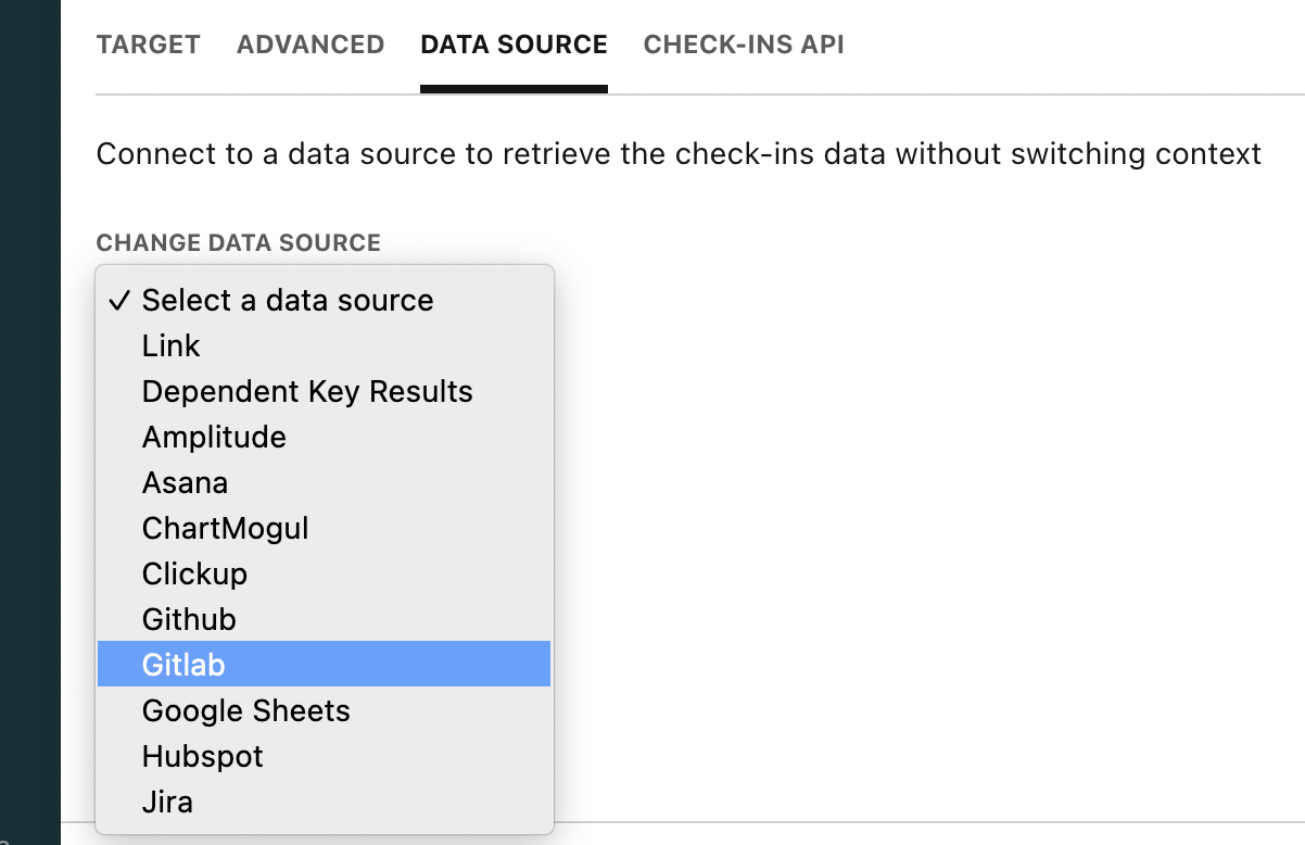 Once Gitlab is connected, you will be able to use it as a data source for your outcomes/KRs.