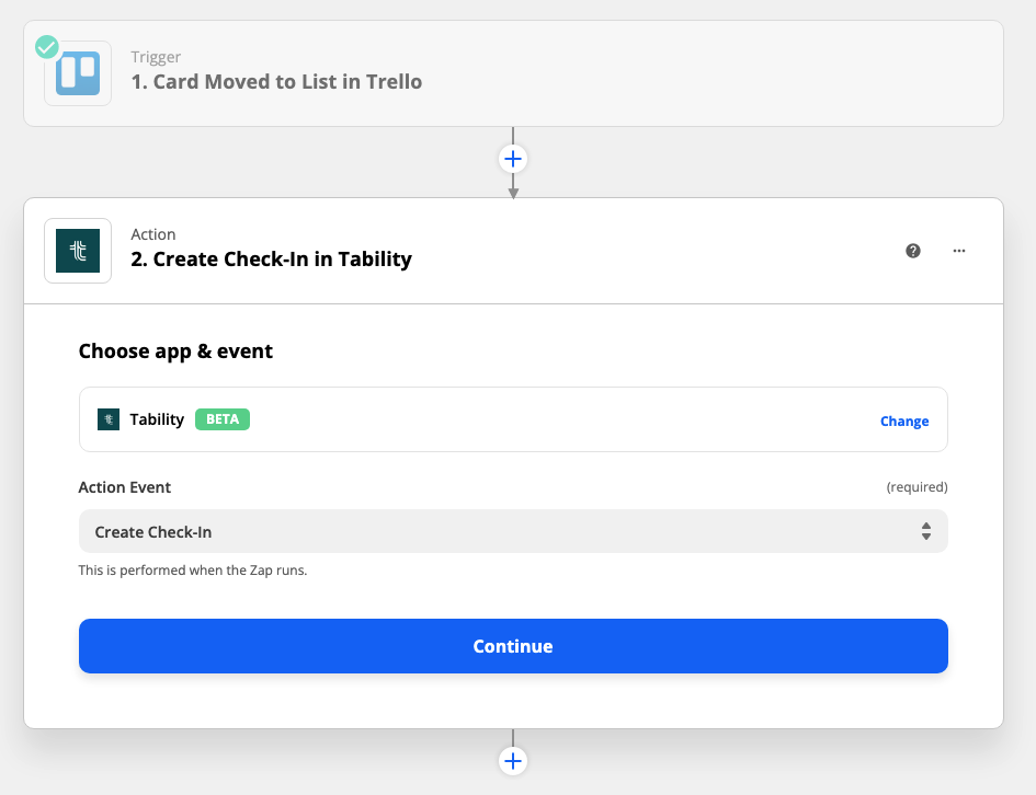 Add the Create Check-In in Tability action. In Zapier, find the Tability app, and then pick the Create Check-In in Tability action.