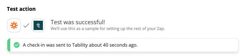 Enable your integration. Once you're done with the configuration you can test your action in Zapier. You should get a simple confirmation message, and see a new check-in on your outcome graph in Tability.